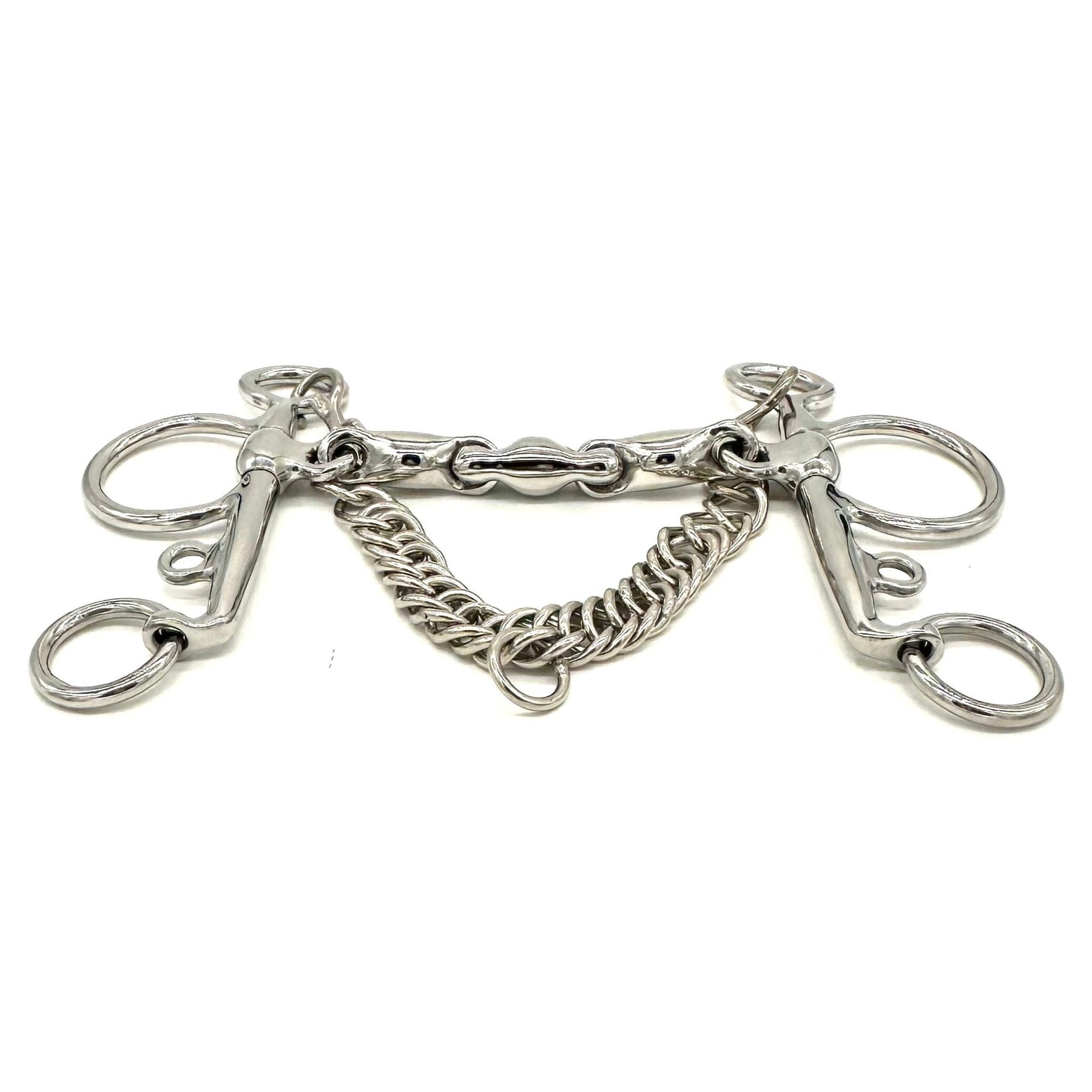 By removing vertical play, this “pinchless” design helps avoid any unpleasant pinching or collapsing that can occur in standard Waterfords. The locking mechanism also creates a more accurate contact, as the mouthpiece’s focused action provides clear and consistent signals to the horse. The series of smooth oval links still discourages horses from bracing or leaning, as there is no rigid surface to latch onto.